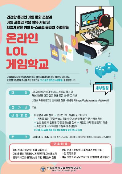 [KNT한국뉴스타임] 서울특별시교육청 산하 학생교육원은 11월부터 12월까지 건전한 게임문화 조성과 게임과몰입 치유·지원 및 재능 개발을 위해 「지금은 LOL(놀)시간! LOL(놀)면서 공부하는 온라인 게임 학교」를 비대면으로 운영한다.