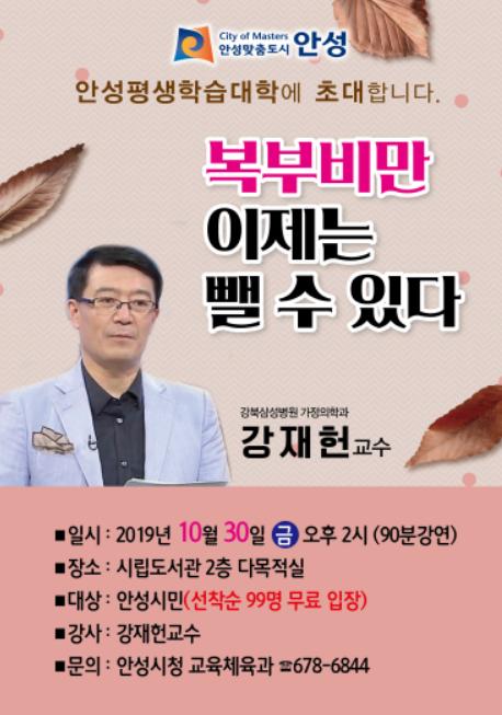 [KNT한국뉴스타임] 안성시는 오는 30일 오후 2시 안성시립도서관 다목적홀에서 안성평생학습대학 3회차 강연으로 비만분야의 최고 권위자 강재헌 교수를 초청하여 ‘복부비만, 이제는 뺄 수 있다’라는 주제로 강연을 펼칠 예정이라고 밝혔다.