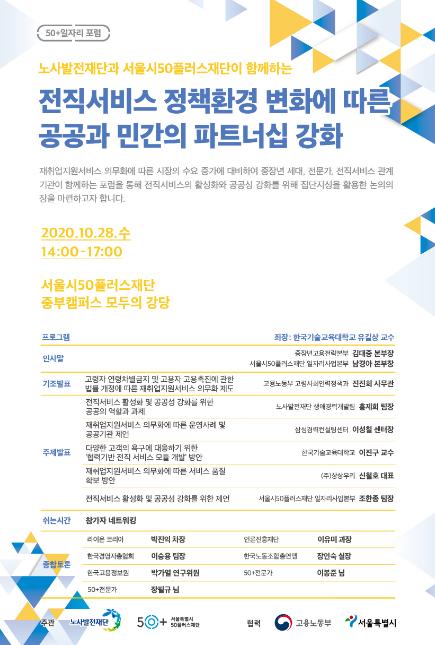 [KNT한국뉴스타임] 서울시50플러스재단은 의무시행에 들어간 중장년 전직(재취업)서비스 활성화와 제도 안착 방안을 논의하기 위해 노사발전재단(사무총장 정형우)과 함께 28일(수) ‘전직서비스 정책 포럼’을 개최한다.