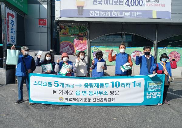 이번 캠페인은 진건읍 시가지와 진건농협 하나로마트 앞에서 진행되었으며, 참여자들은 홍보전단지와 홍보스티커를 부착한 마스크를 나눠주며 시민들의 호응을 이끌어냈다.