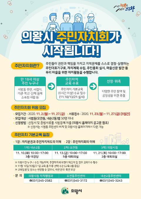 주민자치회 위원을 희망하는 주민을 대상으로 11월 10일에 내손2동 주민센터에서, 13일에 오전동 주민센터에서, 21일에 의왕시청에서 기본교육이 실시된다. 지원대상자는 주민자치 기본교육을 6시간 이상 사전 이수하여야 하며, 11월 27일까지 신청서 및 증빙서류를 구비하여 해당 동 주민센터로 신청하면 된다.