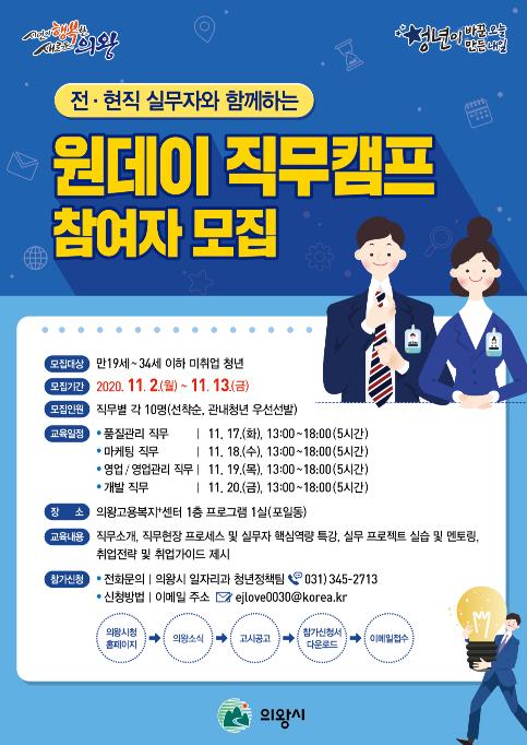 [KNT한국뉴스타임] 의왕시는 청년들의 취업성공을 위한 취업역량강화 프로그램으로 취업캠프 3회, NCS집중캠프를 2회를 운영한데 이어, 오는 11월 17일부터 ‘원데이 직무캠프’프로그램을 운영한다고 밝혔다.