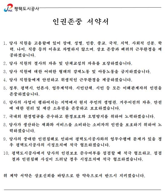 [KNT한국뉴스타임] 평택도시공사는 오는 11월부터 평택도시공사(이하 공사)와 계약하는 기업의 인권 보호를 장려하기 위해 “인권존중 서약서” 제도를 시행한다고 밝혔다.