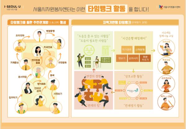 [KNT한국뉴스타임] 서울시자원봉사센터는 타임뱅크 프로그램으로 지역사회 주민 누구나 봉사자로서 함께 활동하는 “우리동네 시간은행”과 시민주도형 단체발굴을 위한 타임뱅크 스타트업 “서로-연결 프로젝트”, 청소년봉사학습을 위한 “연결된 배움” 모듈개발 등을 관계중심 자원봉사를 시도하고 있다.