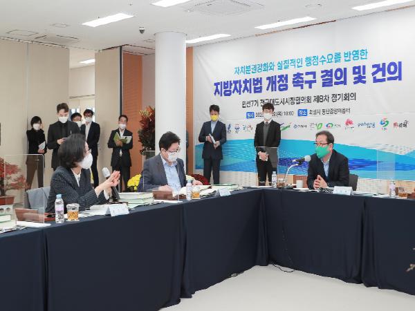 이날 정기회의에는 조광한 남양주시장을 비롯해 윤화섭 안산시장, 서철모 화성시장, 이강덕 포항시장, 염태영 수원시장, 백군기 용인시장, 은수미 성남시장, 장덕천 부천시장, 최대호 안양시장, 한범덕 청주시장, 김승수 전주시장, 전만권 천안부시장, 강덕출 김해부시장 등 13명이 참석한 가운데, 자치분권 강화와 국가 균형 발전을 위한 지방자치법 개정 등을 중점 논의했다.