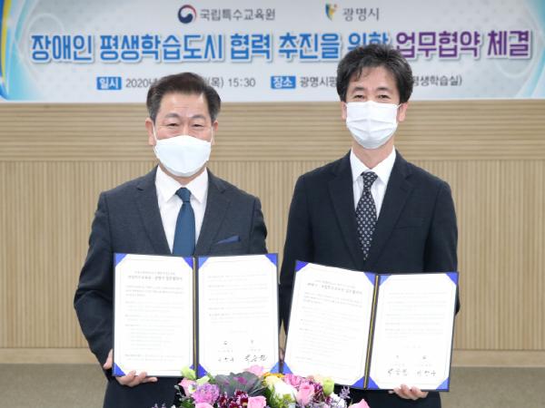 [KNT한국뉴스타임] 평생학습도시 1호이자 전국 첫 ‘장애인 평생학습도시’를 선언한 광명시(시장 박승원)가 지난 29일 광명시 평생학습원에서 장애인 평생교육을 담당하고 있는 정부 기관인 국립특수교육원(원장 이한우)과 ‘장애인 평생학습도시 조성을 위한 업무협약’을 체결했다.
