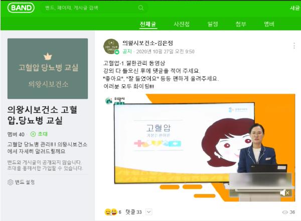 보건소에서는 고혈압·당뇨병의 질환관리, 영양관리, 운동관리, 가정용 혈압기·혈당기 측정법 등의 강의를 사전 녹화하여 매일 한편씩 영상교육을 실시하고 있고, 교육생들은 댓글이나 글쓰기로 궁금한 점은 언제든지 질문하면서 양방향 소통교육이 이루어지고 있다.