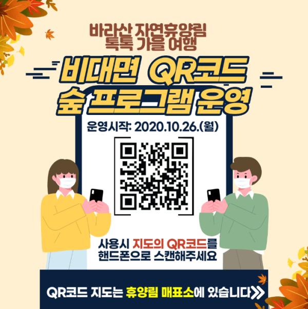이번 프로그램은 코로나19 장기화로 신체활동이 부족해진 이용객들의 건강증진을 위해 마련한 비대면 숲 프로그램으로, 휴양림 체크인사무소에 비치된 비대면 숲 프로그램 지도를 소지한 후 QR코드 해당 지점에서 모바일을 통해 QR코드를 스캔하여 동영상을 재생하면 된다.