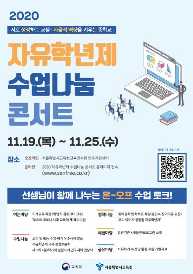 [KNT한국뉴스타임] 서울특별시교육청은 11월 19일부터 11월 25까지 서울특별시교육청교육연수원 연수지원센터에서 7일간 중학교 교원, 교육전문직원 및 학부모를 대상으로「2020 자유학년제 수업나눔 콘서트」를 개최한다.