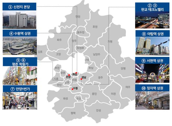 행정동별로 살펴보면, 수원역 중심상권(매산동), 분당신도시 주요 상권(성남시 야탑1동, 서현1동, 정자1동), 안양1번가(안양1동)는 유동인구가 크게 감소하여 상권에 큰 영향을 끼쳤고, 판교테크노밸리(성남시 삼평동, 시흥동)는 코로나19로 인한 정보통신기업 주도 재택근무 영향으로 주중 유동인구가 감소했다.
