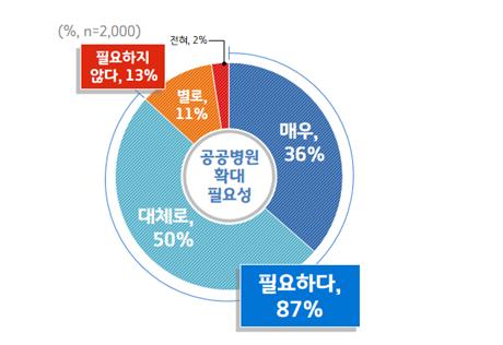 경기도는 9월 25일부터 10월 7일까지 도민 2,000명을 대상으로 공공보건의료 관련 여론조사를 실시한 결과, 응답자의 87%가 경기도의료원과 같은 공공병원 확대에 대해 ‘필요하다’고 답했다고 밝혔다. 응답자의 76%는 경기도의료원의 개수가 ‘충분하지 않다’고 답해 도민 대다수가 공공병원 확대 필요성에 높은 공감을 보였다.