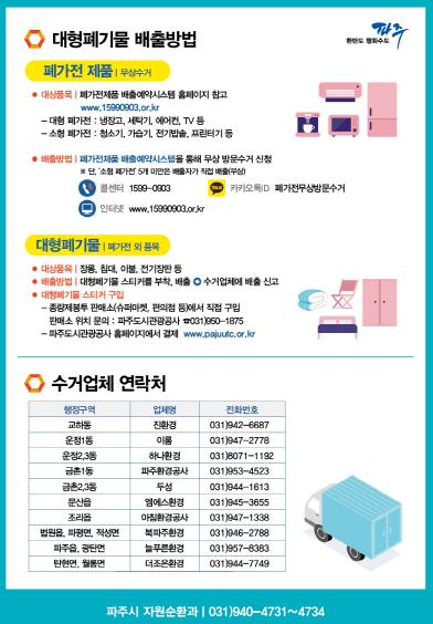 장롱, 침대와 같은 대형폐기물을 버릴 때에는 슈퍼마켓에서 대형폐기물 스티커를 구입하거나 인터넷으로 수수료를 납부한 후 버려야 하는데, 품목 분류가 한정돼 있어 시민들이 품목을 쉽게 파악하지 못했다. 이에 파주시는 조례 개정을 통해 대형폐기물 분류를 기존 69개에서 161개로 보다 세분화했다.
