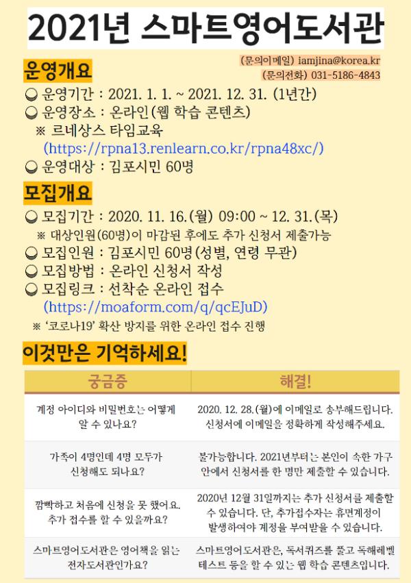 스마트영어도서관은 김포시민 60명을 대상으로 11월 16일 오전 9시부터 온라인(https://moaform.com/q/qcEJuD)으로 접수하며, 기타 궁금한 사항은 전화(☎031-5186-4843)로 문의하면 된다.