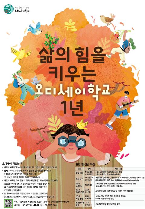 오디세이학교는 일반고 진학 예정인 중학교 3학년 혹은 중학교 졸업자와 동등의 학력이 인정된 자를 대상으로 학생을 모집한다. 학생의 자기소개서 등을 통한 서류 심사와 학생ㆍ학부모 면접을 통해 성실성과 참여 의지, 오디세이학교 운영 취지와 방향에 대한 이해도 등을 기준으로 최종 합격자를 선정할 예정이다. 자세한 학생 모집 내용은 오디세이학교 누리집에서 확인할 수 있다.