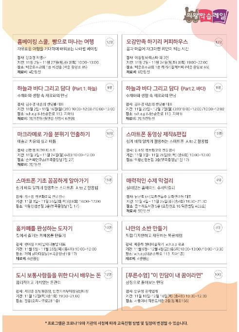 의왕인생대학에서 준비한 프로그램은 △도시 보통사람들을 위한 다시 배우는 돈 △홈카페를 완성하는 도자기 △나만의 소반 만들기 △홈카페를 완성하는 도자기 △마크라메로 가을분위기 연출하기 등 총 13개의 차별화된 프로그램들이 준비되어 있다.