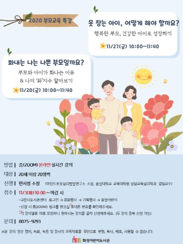 [KNT한국뉴스타임] 고양시 화정어린이도서관에서는, 부모와 자녀의 건강한 소통을 위한 ‘2020 부모교육 특강’을 온라인 비대면 방식으로 운영한다고 2일 밝혔다.