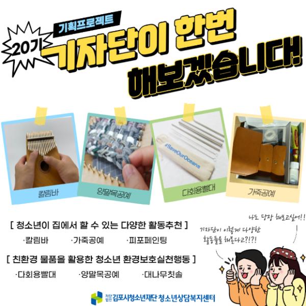 [KNT한국뉴스타임] 김포시청소년재단 청소년상담복지센터는 장기화되는 코로나19로 지쳐있는 청소년들을 위해 청소년 기자단이 직접 나서 집에서도 즐길 수 있는 다양한 청소년 활동을 소개하고 홍보하는 기획 프로젝트인 ‘기자단이 한번 해보겠습니다’를 11월 한 달간 운영한다.