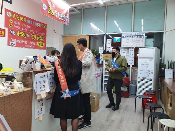 이날 구청 직원 20명은 상가 일대를 돌며 시민들과 영업주를 대상으로 소독 티슈와 불법광고물 처벌 등의 내용이 담긴 안내문 500장을 배부하고 통행에 지장을 주는 에어라이트, 배너 등을 정비했다.