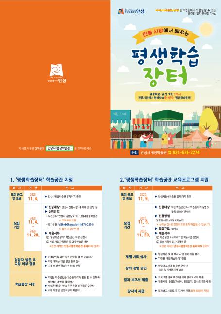 평생학습장터 지정 신청 대상은 전통시장 내에 카페 및 공방 등 학습동아리가 활동할 수 있는 공간이라면 어디든 신청 가능하다. 또한, 추후 지정된 학습공간에서 평생학습 프로그램 운영 시 강사비를 지원받을 수 있으므로 안성시민의 적극적인 참여를 당부했다.