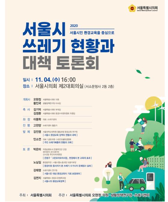 서울시의회 환경수자원위원회 오현정 의원(더불어민주당, 광진2)은 생활정책연구원(이사장 황인국), 쓰레기센터(대표 이동학)와 공동주관으로 지난 11월 4일 오후 4시 서울시의회 제2대회의실에서 「서울시 쓰레기 현황과 대책토론회 ? 서울시민 환경교육을 중심으로」를 개최했다.