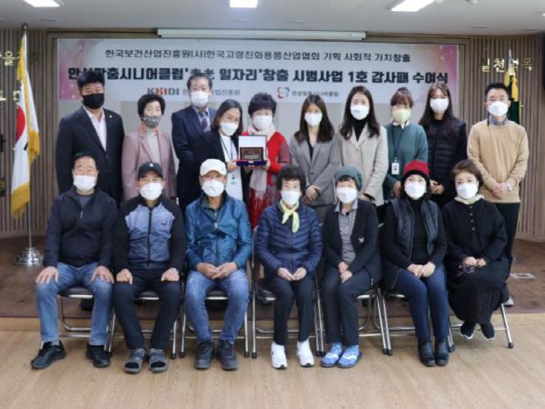 [KNT한국뉴스타임] 안성시 안성맞춤시니어클럽은 한국보건산업진흥원이 기획한 ‘靑老 일자리’ 창출사업을 7월부터 시범 진행하여 성과를 걷어 진흥원으로부터 감사패를 전달받았다고 밝혔다.