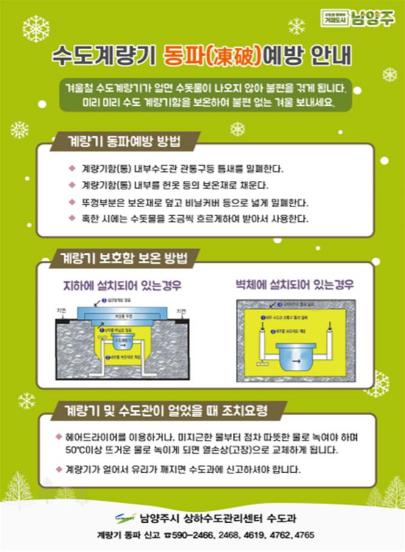 또한, 시는 계량기 동파예방을 위해 지역별 동파 취약 수용 가구를 사전에 조사하여 노후 된 계량기 보호통 덮개 및 보온재를 교체하고 수도관 및 수도계량기 동파 시 신속한 교체로 주민불편을 최소화하기 위해 지역을 5권역으로 구분 생활민원업체를 24시간 운영할 계획이다.