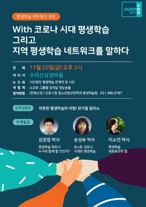 [KNT한국뉴스타임] 관내 평생학습 네트워크 강화를 추진하고 있는 군포시가 11월 20일 코로나19 시대 평생학습과 지역 네트워크를 주제로 시민들과 함께 하는 포럼을 온·오프라인으로 개최한다.