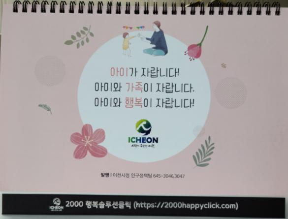 [KNT한국뉴스타임] 이천시는 ‘아이와 가족이 자랍니다’‘아이와 행복이 자랍니다’라는 주제로 2021년 육아정보 탁상용 달력을 제작해 주민이 자주 방문하는 어린이도서관, 아이랑카페, 문화센터 등 기관에 배부한다고 밝혔다.