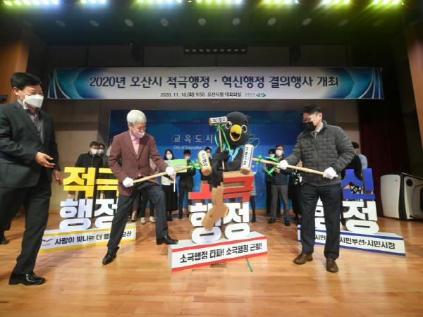 이날 곽상욱 시장과 김능식 부시장은 오산시를 대표하는 까산이와 함께 소극행정을 격파하는 퍼포먼스를 연출하며 적극행정과 혁신행정을 통한 소극행정 혁파에 대해 강력한 의지를 드러냈다.