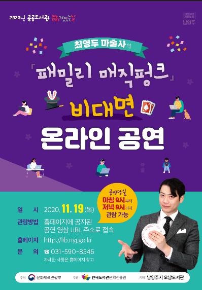 [KNT한국뉴스타임] 남양주시는 오남도서관에서 오는 11월 19일에 ‘공공도서관 문화가 있는 날’비대면 온라인 공연을 운영한다고 밝혔다.