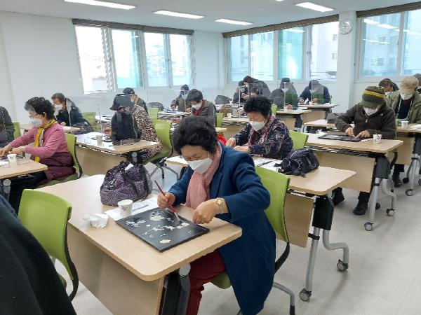 특히 두뇌자극교육 시간에는 관내 나전칠기옻칠 명인인 김길수 한국예술문화명인 아카데미 원장을 초빙하여 자개공예로 생활 공예품(전통문양 쟁반)을 만들며, 조개껍데기의 아름다운 빛깔과 우리나라의 전통적인 문양을 통해 오감을 자극하는 시간을 가졌다.