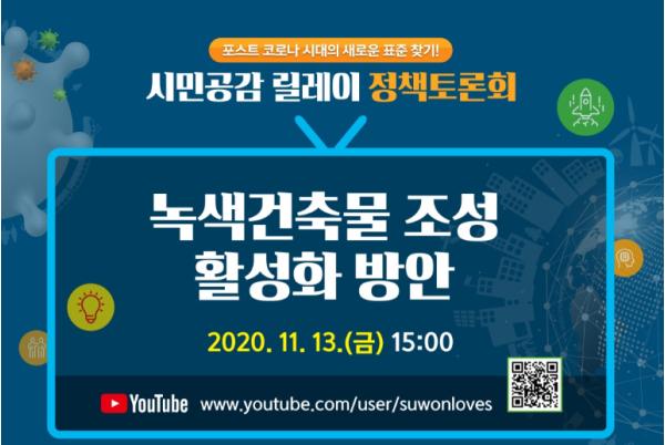 [KNT한국뉴스타임] 수원시는 11월 13일 오후 3시 수원시청 중회의실에서 채창우 건설기술연구원 국민생활연구본부장을 좌장으로 건축 분야 전문가 등 7명이 ‘녹색건축물 조성 활성화 방안 모색 ’ 주제로 시민 공감 릴레이 정책토론회를 개최한다고 밝혔다.
