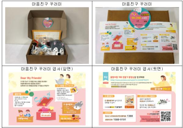 마음친구 꾸러미는 물멍어항 만들기 키트, 오늘 내 기분 달력, 스트레스 해소 인형, 가족대화 놀이카드, 포춘쿠키, 초코렛 등 총 8종의 물건으로 구성되었다.