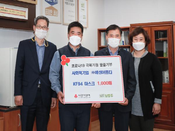 사회적기업(주)예성아름터(대표 김정삼, 김연아)는 지난 11일 코로나19 확산 방지를 위한 KF94 마스크 1,000매를 경기사회복지공동모금회에 전달했다.