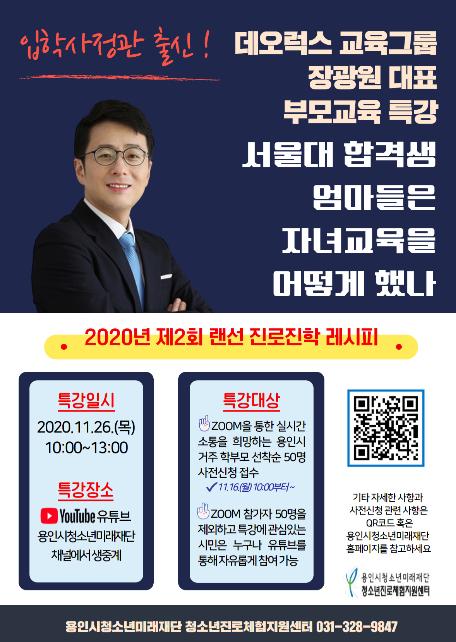 이번 부모교육 특강은 2020년 제2회 랜선 진로진학 레시피 프로그램으로 오는 11월 26일 목요일 10시에 유튜브 용인시청소년미래재단 채널에서 실시간 생중계 된다.
