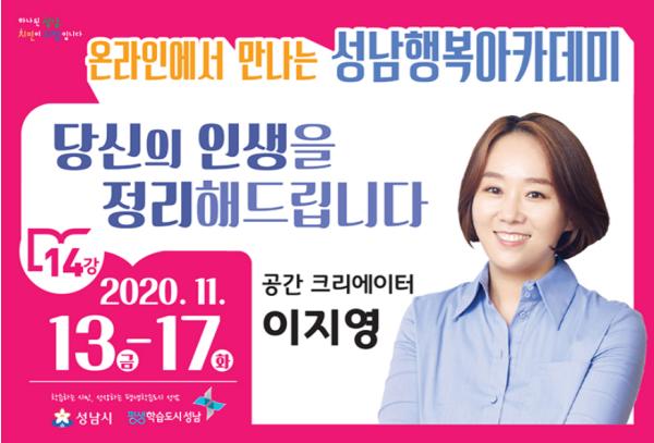 [KNT한국뉴스타임] 성남시는 성남행복아카데미 강연 열네 번째 이야기로 이지영 공간 크리에이터를 초청, ‘당신의 인생을 정리해드립니다’라는 주제로 13일부터 17일까지 5일간 유튜브 ‘성남TV’를 통해 시민들과 만나는 자리를 마련한다.