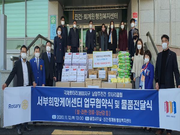 [KNT한국뉴스타임] 남양주시 진건로타리클럽(대표 김신애)은 지난 12일, 남양주시 서부희망케어센터(센터장 신영미)와 함께 지역사회 후원을 위한 협약식을 실시하고, 지역 내 취약계층을 위한 500만원 상당의 후원물품을 전달했다.