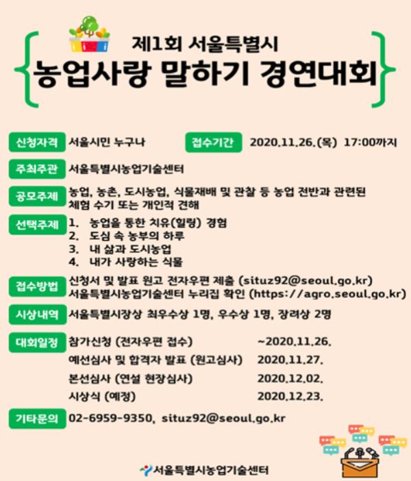 농업사랑 말하기 경연대회는 서울시민 누구나 참여 가능하며, 참가 희망자는 11월 26일(목) 17시까지 참가신청서와 발표 원고를 전자우편으로 제출하면 된다.