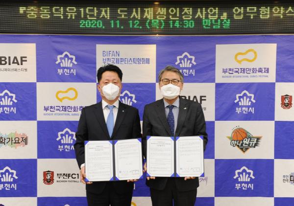 [KNT한국뉴스타임] 부천시는 지난 12일 시청 만남실에서 한국토지주택공사(LH)와 ‘중동덕유1단지 도시재생인정사업’ 협약식이 열렸다.