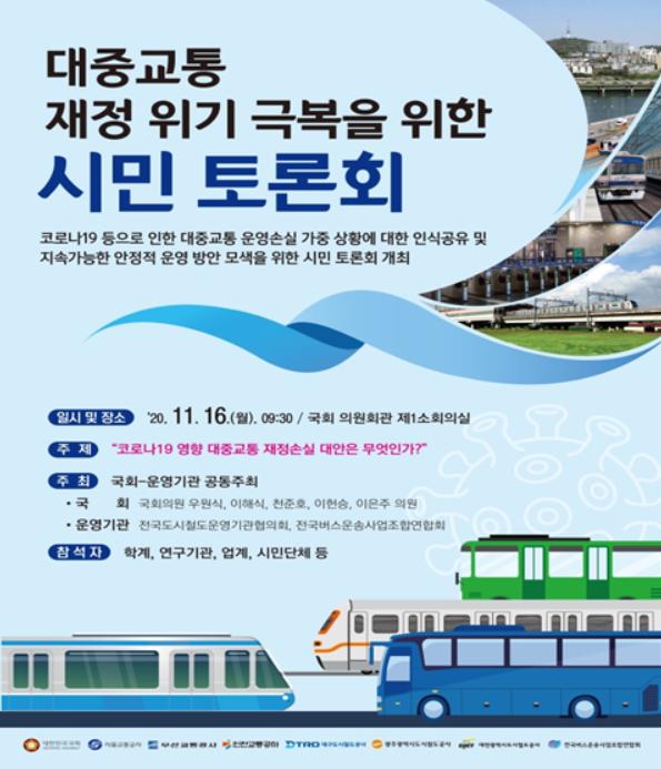 [KNT한국뉴스타임] 서울특별시 서울교통공사 등 전국 6개 도시철도 운영기관은 여야 국회의원(더불어민주당 우원식?이해식?천준호 의원, 국민의힘 이헌승 의원, 정의당 이은주 의원), 전국버스운송사업조합연합회와 16일(월) 9시30분 국회 의원회관 소회의실에서 ?대중교통 재정 위기 극복을 위한 시민토론회?를 공동 개최한다고 밝혔다.