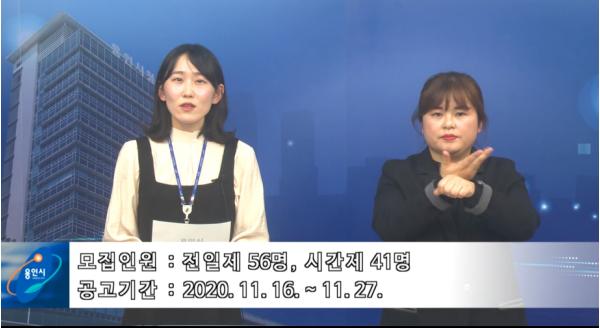 [KNT한국뉴스타임] 용인시는 장애인들이 일자리 정보를 쉽게 확인할 수 있도록 2021년도 장애인일자리사업 채용공고에 수어, 자막, 음성을 포함한 동영상 채용공고를 제작해 16일부터 27일까지 공고문과 함께 게시한다.