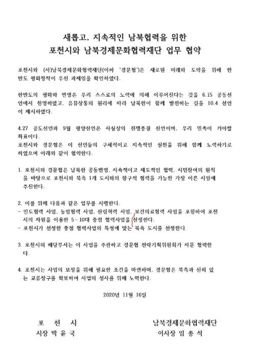 이날 협약식에는 포천시에서는 박윤국 시장, 포천시의회 손세화 의장, 더불어민주당 이철휘 국방안보특별위원장, 민주평화통일자문회의 양주승포천시협의회장, 이미숙 여성분과위원장, 포천산림조합 남궁종 조합장, 농협포천시지부 이월선 지부장, 대한적십자사 김신인 포천지구협의회장, 포천시 채수정 이통장연합회장, 포천시 권대만 주민자치위원연합회장, 포천시 이경묵 새마을회장, 포천시청 김영택 문화경제국장이 참석하였고, 남북경제문화협력재단에서는 임종석 이사장, 김민기 이사, 이남주 전략기획위원장, 김종천 사업본부장, 김기헌 기획실장, 임채선 사업팀장, 신남수 대외협력국장이 참석하였다.
