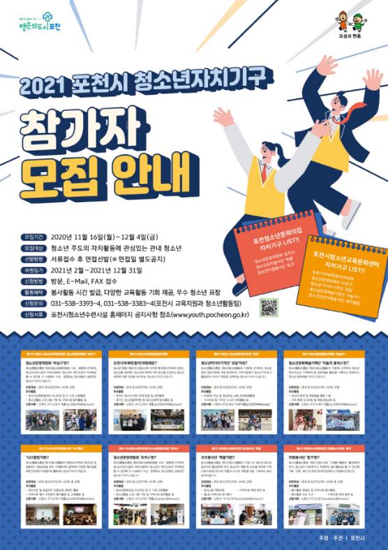 [KNT한국뉴스타임] 포천시 청소년수련시설(포천시청소년교육문화센터 및 포천청소년문화의집)은 12월 4일까지‘2021년 포천시 청소년 자치기구’ 참가 청소년을 모집한다.