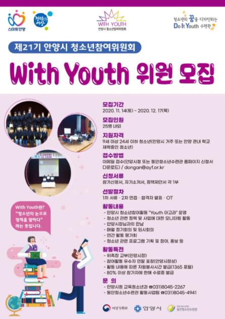 [KNT한국뉴스타임] 안양시 청소년재단 동안청소년수련관이 제21기 안양시 청소년참여위원회 ‘With Youth’ 신입 위원을 모집한다고 밝혔다.