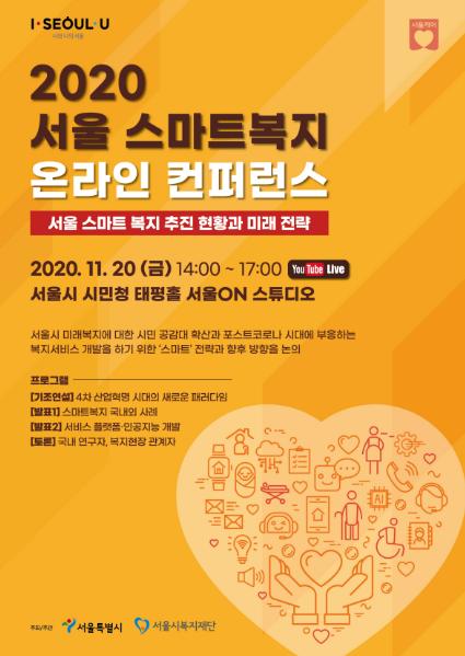 이러한 논의의 일환으로 시와 서울시복지재단은 「2020 서울 스마트복지 온라인 컨퍼런스」를 11.20.(금) 14시~17시까지 ‘무관중?온라인’ 으로 개최한다고 밝혔다.