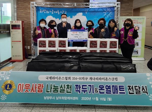 [KNT한국뉴스타임] 국제라이온스협회 354-H지구 개나리라이온스클럽(회장 오혜령)은 지난 16일 취약계층의 따뜻한 겨울나기를 돕고자 깍두기 240kg와 온열매트 13개를 남부희망케어센터(센터장 김기수)에 기탁했다.
