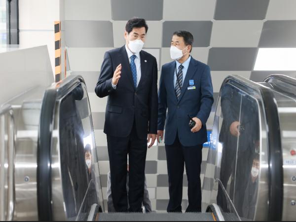 김상돈 의왕시장은 18일 의왕역 에스컬레이터 개통 전 관계공무원을 비롯해 의왕역장, 시공사와 함께 에스컬레이터 시승 및 시설점검을 실시하며,“의왕역을 이용하는 시민들이 이용하는데 불편함이 없도록 안전에 만전을 기해줄 것”을 당부했다.