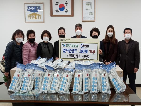 다산행정복지센터(센터장 김진현)는 18일 철마기업인회 ㈜위너스(대표 김창성)에서 취약계층을 위해 써달라며 멀티콘센트 100개를 다산1동 지역사회보장협의체(이하 협의체, 위원장 정순옥)로 기부했다고 밝혔다.