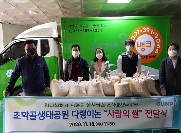 [KNT한국뉴스타임] 군포시는 11월 18일 초막골생태공원 내 다랭이논에서 수확한 무농약 쌀을 어려운 이웃을 위해 전해달라며 군포기초푸드뱅크에 기탁했다.