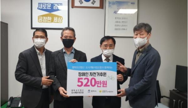 [KNT한국뉴스타임] 평택시와 평택지역자활센터는 지난 18일 평택시청 복지교육국장실에서 ㈜평택모산영신 도시개발사업조합으로부터 장애인 자전거 2대(520만원상당)를 전달 받았다고 밝혔다.